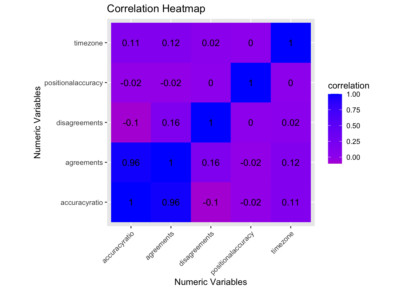 After creating the correlation heatmap comparing my numeric variables (these include: id agreements, id disagreements, overall accuracy of identification, positional accuracy, and time zone/location estimate), it appears there is no strong correlation between any of the variables. My initial questions of relation between id accuracy ratio and location (timezone) and the relationship between disagreements and positional accuracy could be answered with this data in that there is little to no relationship between these variables.