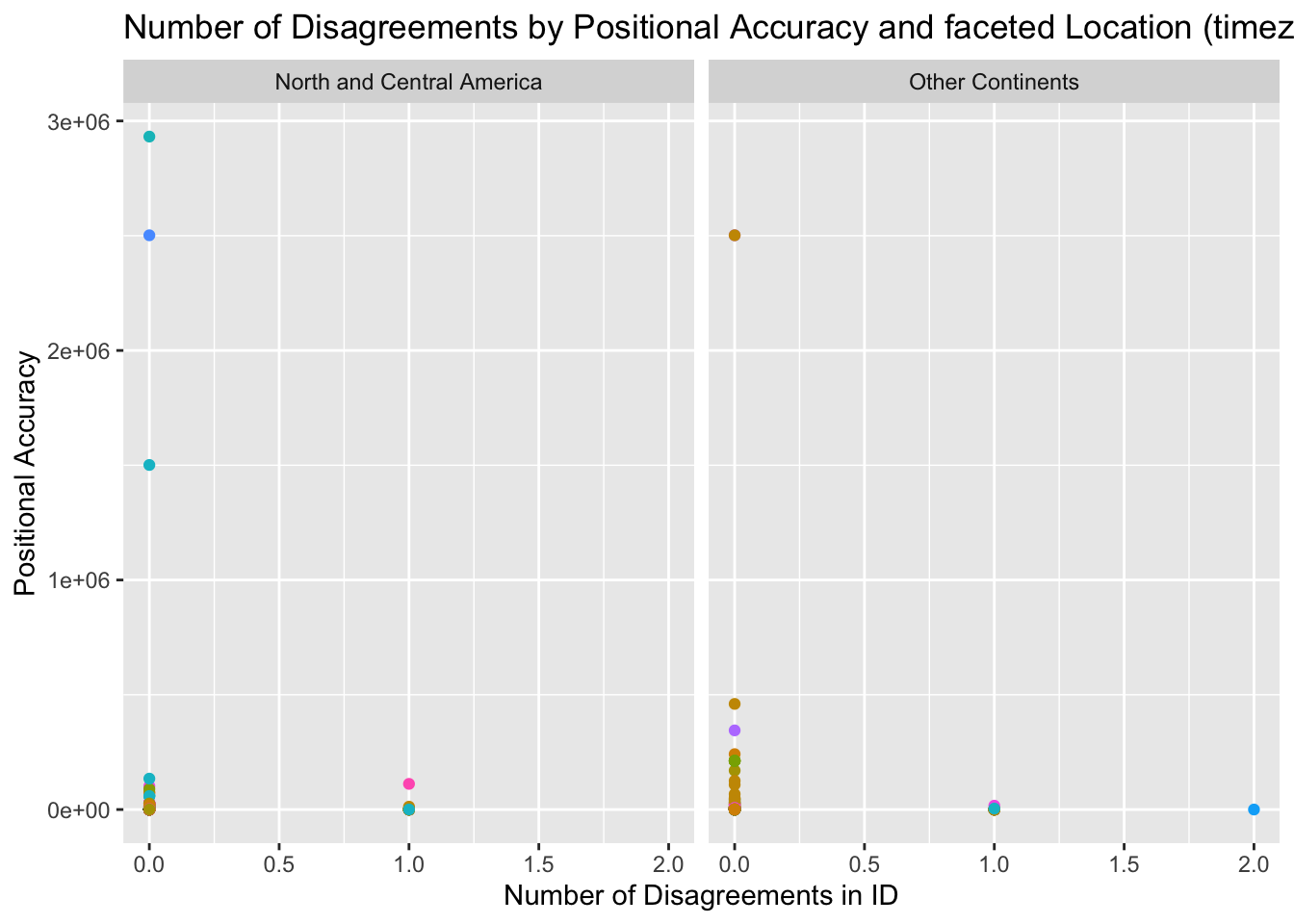 After creating this scatterplot that compares positional accuracy and number of disagreements while faceting by location (time zone estimate), not much information can be drawn from the results. It appears that most of the data has zero disagreements no matter the positional accuracy rating. In addition, there seems to be a slightly higher range in the number of disagreements among observations from non-North American continents while there is a higher range in positional accuracy. These discrepancies could be attributed to outliers.