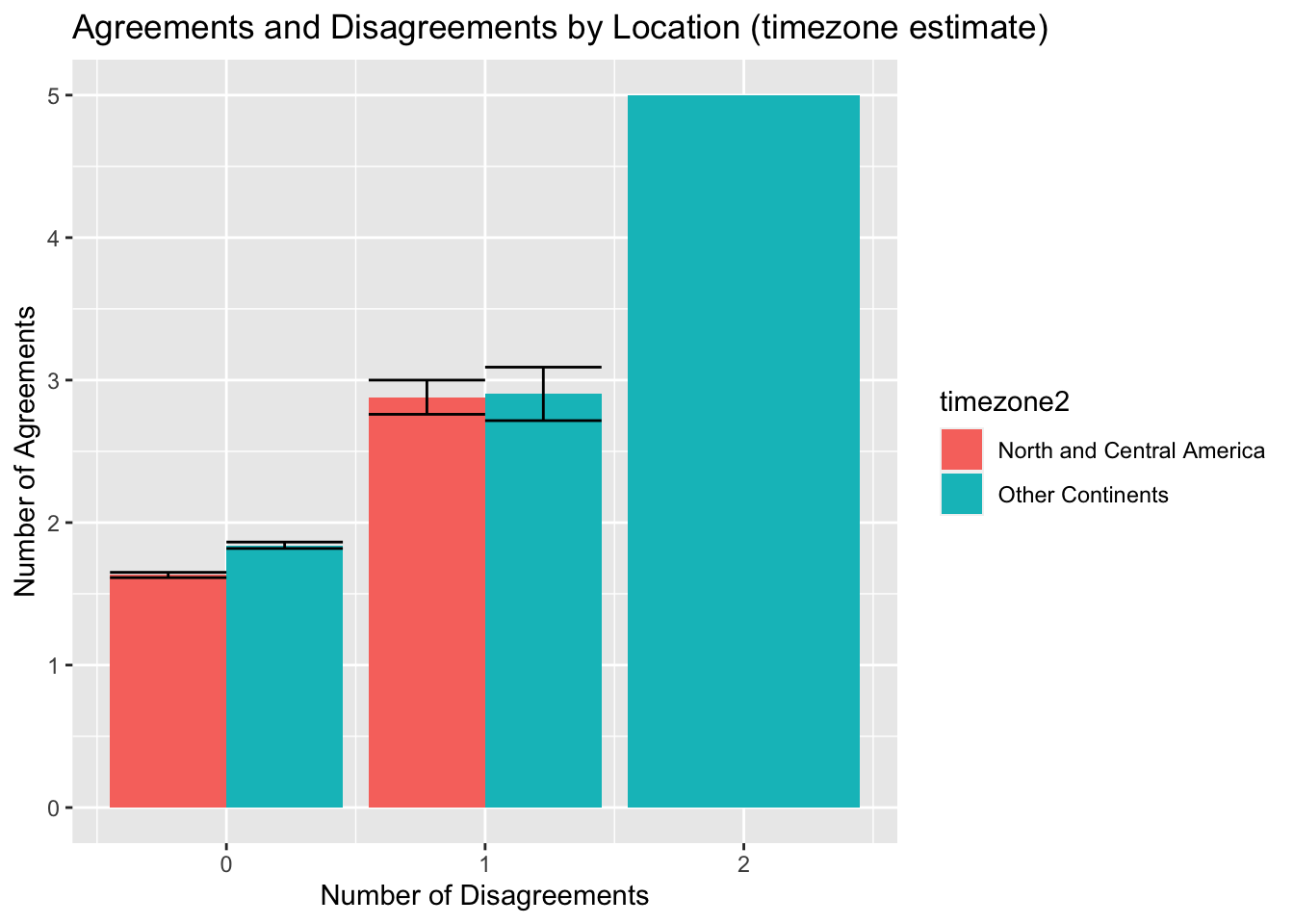 ggtitle("Agreements and Disagreements by Location (timezone estimate)") +