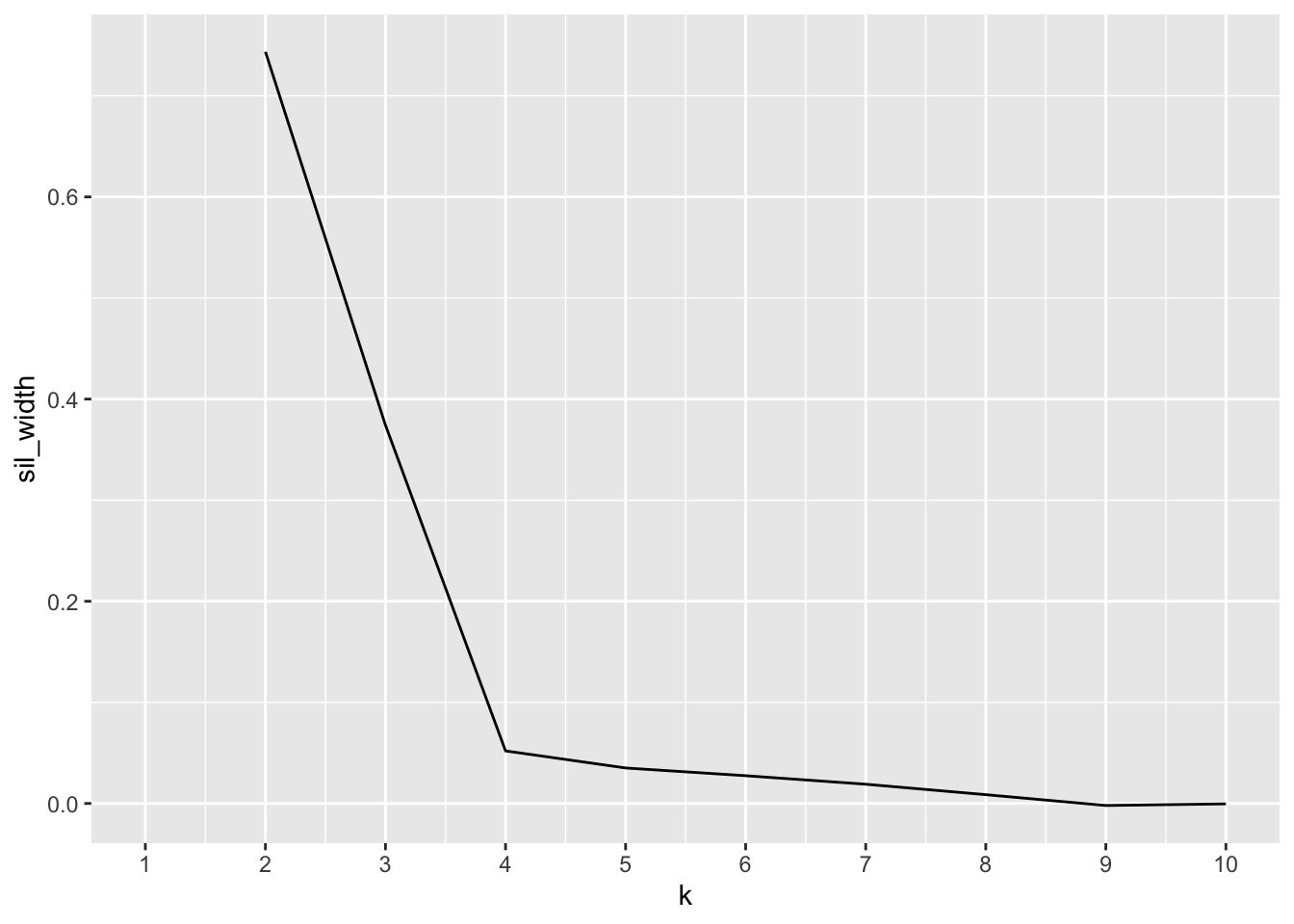 ggplot()+geom_line(aes(x=1:10,y=sil_width))+scale_x_continuous(name="k",breaks=1:10)