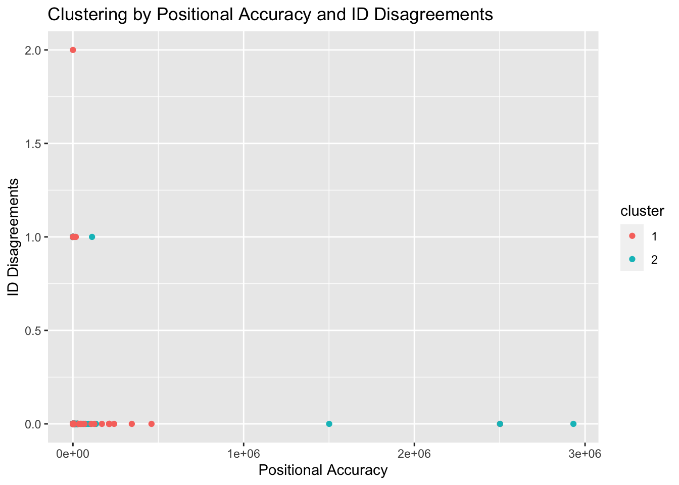 ggtitle("Clustering by Positional Accuracy and ID Disagreements") +