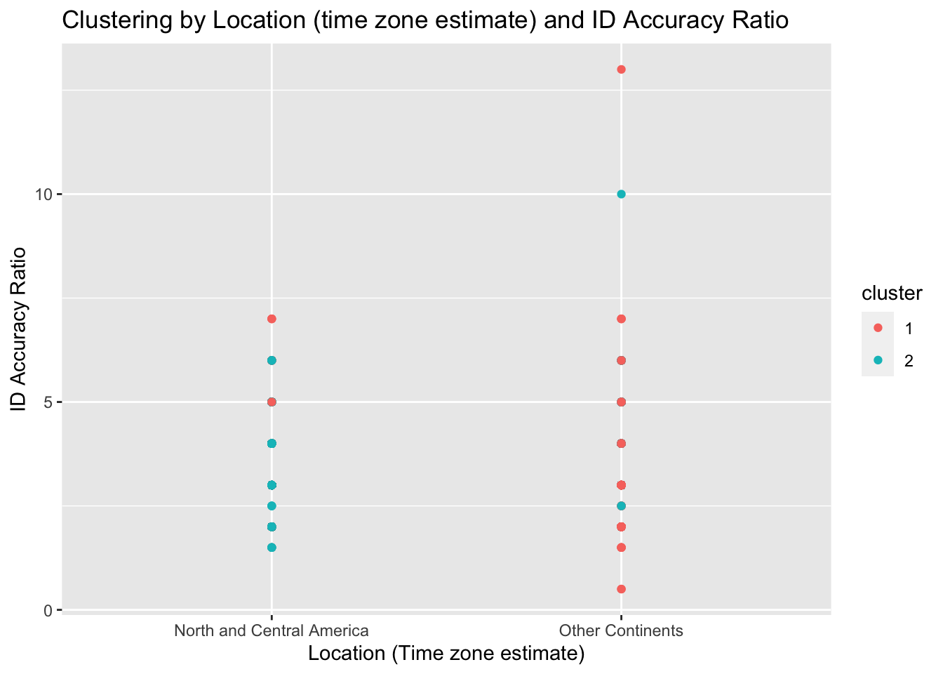 ggtitle("Clustering by Location (time zone estimate) and ID Accuracy Ratio") +
